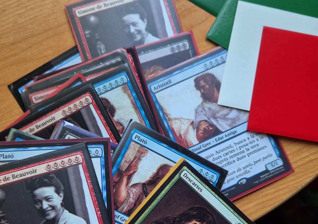 El juego está en desarrollo, pero de momento estoy utilizando versiones beta de las cartas para gamificar mis asignaturas de Filosofía en el instituto. Las alumnas pueden obtener estas cartas mediante la participación en clase o la realización exitosa de las tareas que se desarrollan durante el curso. Estas cartas son intercambiables por una subida en la nota final de la asignatura (1 carta = +0,1 puntos), una suerte de moneda de cambio que les sirve para visualizar su progreso y recibir una compensación inmediata cuando realizan acciones positivas para su aprendizaje. He comprobado que la motivación aumenta de forma considerable y planeo integrar otras mecánicas de juegos en el futuro para seguir gamificando mis asignaturas.